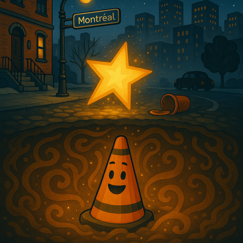 Over time, a society quietly formed beneath the city’s streets – Coneville – a hidden borough powered by fluorescent light and municipal pride. It’s located in a forgotten underground service tunnel near the intersection of Boulevard de Maisonneuve and Rue du Coneway (the humans misspell it as “Conway”).